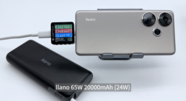 llano 65W 20000mAh 為Redmi Turbo 3充電,使用POWER-Z KM003C測得充電功率為8.24V 2.97A 24.47W。