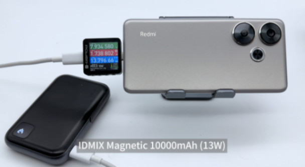 IDMIX Magnetic 10000mAh 為Redmi Turbo 3充電,使用POWER-Z KM003C測得充電功率為7.93V 1.74A 13.80W。