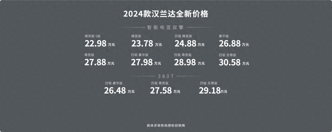 2024款漢蘭達的指導價是24.98-32.58萬元,雙擎版相比2023款售價最高下調2.3萬,燃油版售價最高下調3.3萬,目前線下探訪的兩家門店均表示新車有2萬現金優惠,現在預定,最快一個月可以提車。