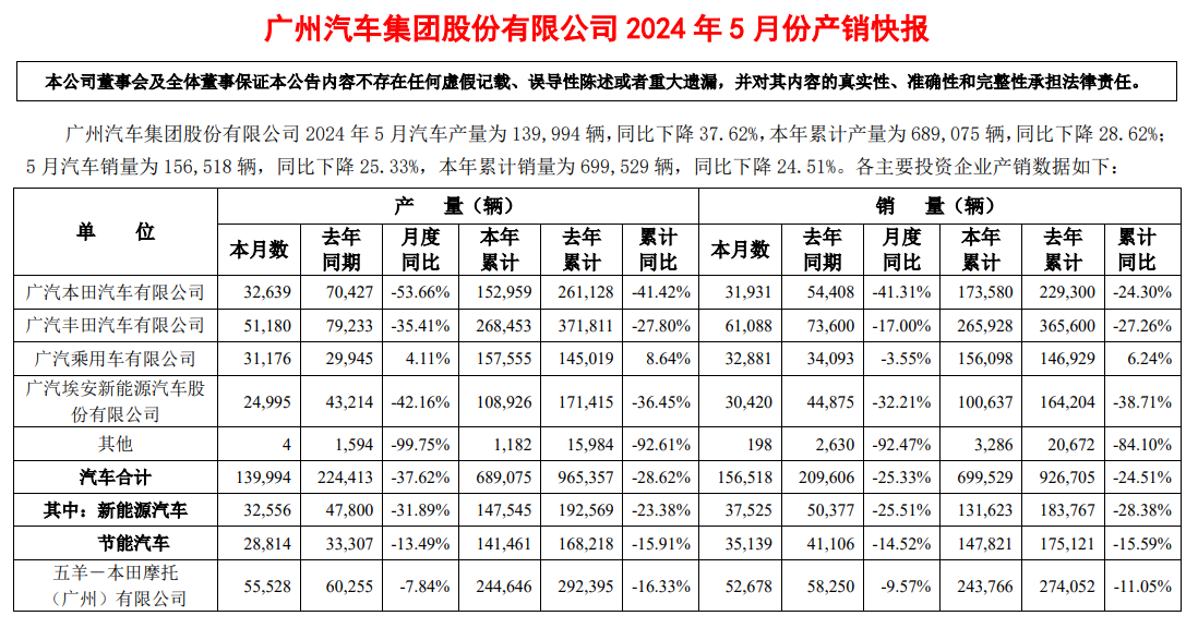 銷售方面,據(jù)廣汽公開信息,5月份其汽車銷量為156,518 輛,同比下降25.33%,本年累計(jì)銷量為699,529輛,同比下降24.51%。