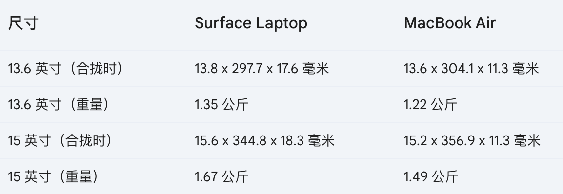 蘋果和微軟都非常注重筆記本電腦的重量和厚度。現款 13.6 英寸 MacBook Air 重約 1.22 公斤,合攏時厚度約 1.12 厘米,而 13.8 英寸 Surface Laptop 略微重一點,重約 1.35 公斤,厚度約 1.75 厘米。