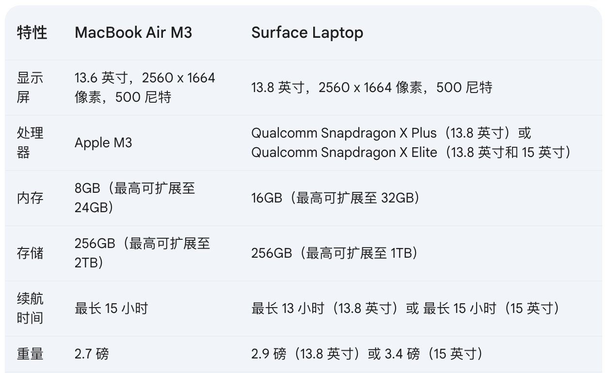 - 處理器:Surface Laptop 使用基于 ARM 的 Qualcomm Snapdragon X 系列處理器,而 MacBook Air 使用 Apple 自有的 M 系列芯片。