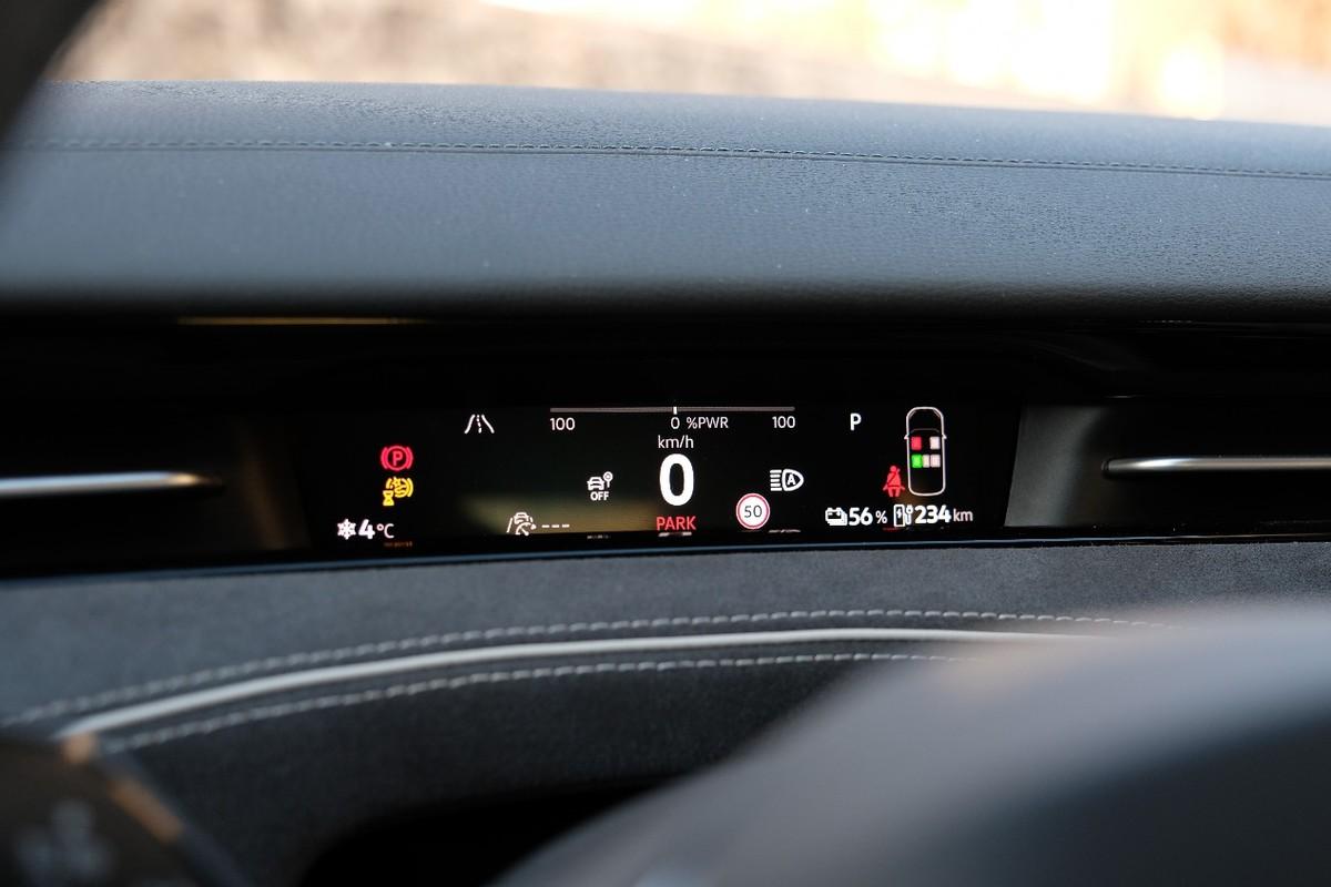 方向盤后方鑲嵌著一塊細長條狀液晶顯示屏,別看它的尺寸小,屏幕擁有高分辨率,所顯示信息也比較豐富,有種麻雀雖小五臟俱全的既視感。
