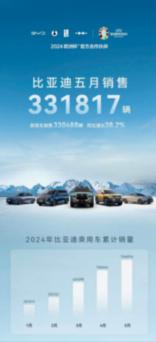 5月份,比亞迪銷售331817輛,含乘用車出口37499輛,同比增加38.2%。截止今年5月,比亞迪汽車年度銷售總量已經(jīng)126萬輛。