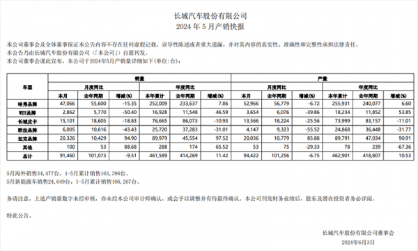 長城汽車公告,5月總計銷量 91460 臺,相較于去年同期下降了9.46%,與上月相比下降了3.52%。據(jù)統(tǒng)計,截至5月底,長城汽車的累計銷量已達461589輛,同比增長了11.42%。