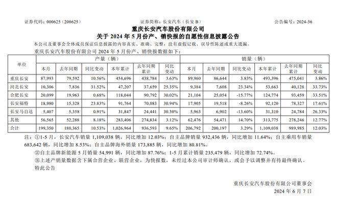 近日,長安汽車公布了5月份銷量狀況,長安5月份銷量為20.68萬輛,同比增長3.92%;其中自主品牌新能源銷量為5.5萬輛,5月自主品牌乘用車銷量123223輛。
