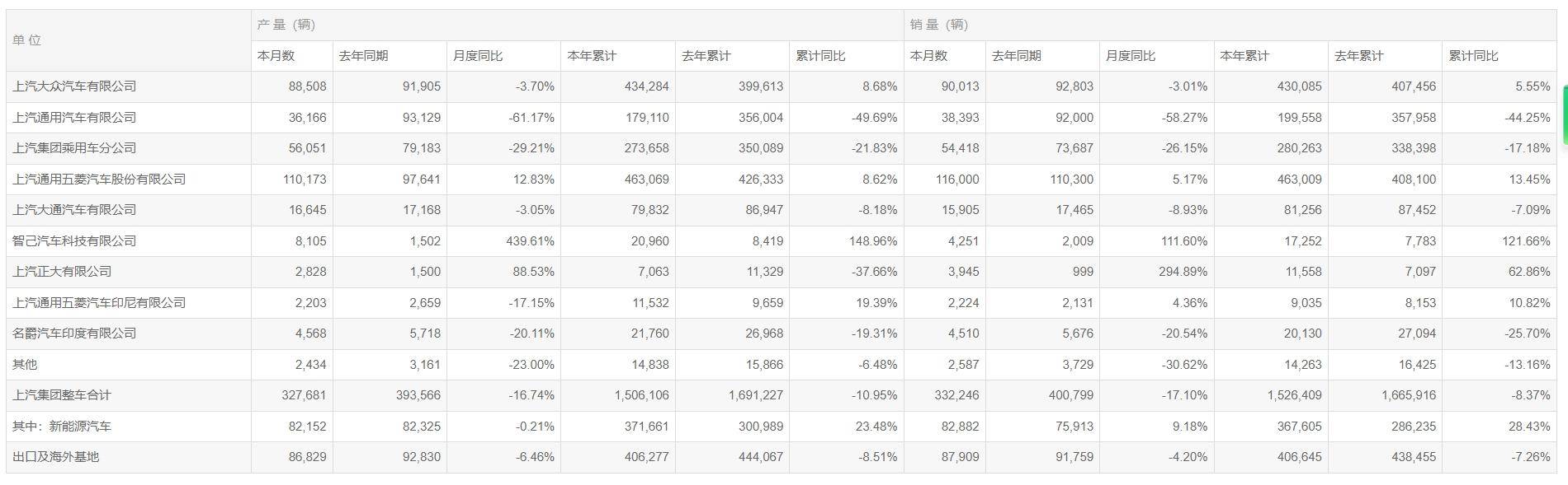 上汽集團發(fā)布產銷快報,5月銷量332,246輛,同比下降17.10%。其中,上汽乘用車銷售56,051輛,同比下滑29.21%,智己銷量為8,105輛。