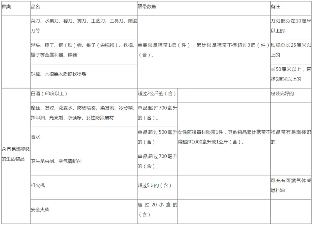 金屬利器、鈍器:菜刀、水果刀、餐刀、剪刀、工藝刀、工具刀、陶瓷刀等,刀刃部分在10厘米以上的不可攜帶;斧頭、錘子、鋼(鐵)銼、錘子(尖銳物)、鐵棍、等,鐵棍總長25厘米以上的不可攜帶;球棒、木棍等木質(zhì)棍狀物品,超過長50厘米以上,直徑6厘米以上的不可攜帶。