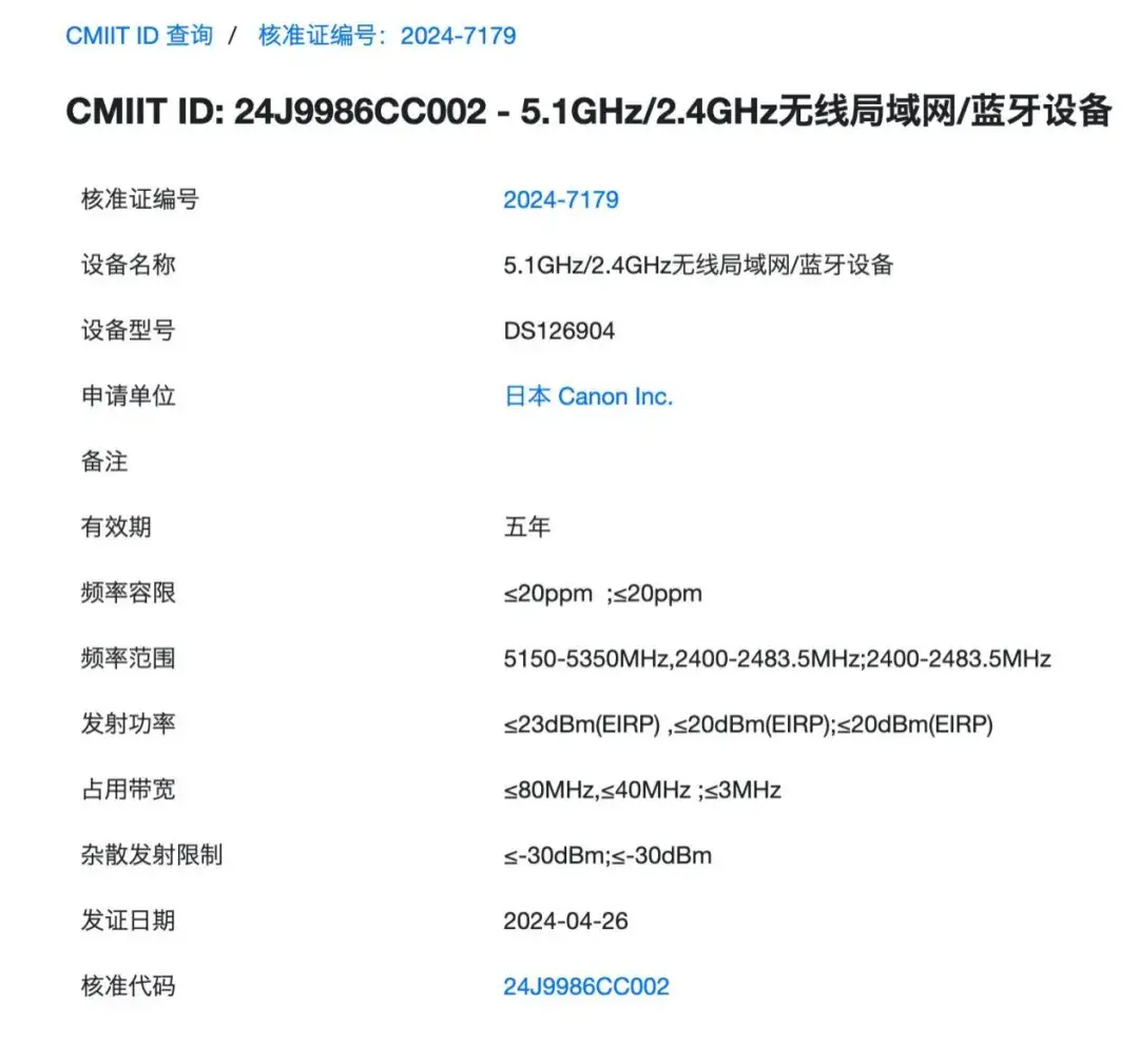 佳能在2024年4月26日再次注冊了一款臨時型號為DS126904的新機。上一款I(lǐng)D174型號的新機被猜測可能是一款主打視頻的攝影機,這款DS開頭的則是一款相機,據(jù)說該相機具有WiFi 5和藍牙功能。