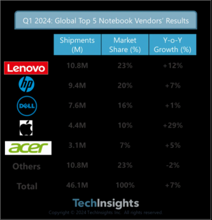 4月29日消息,全球領先的先進技術分析和知識產權服務提供商——TechInsights發布了2024年第一季度全球筆記本電腦出貨量數據,該季度全球筆記本電腦出貨量達到了4610萬臺,同比增長7%。