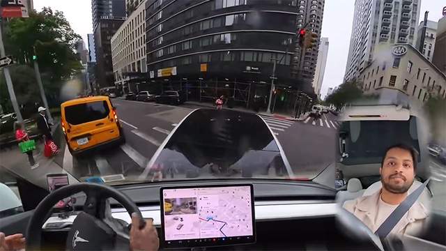 就在5月底,隨著特斯拉FSD V12的更多推送,博主們就把車開到了曼哈頓的中心區(qū)域,一個靜態(tài)要素(不動的基建等)和中國一線城市基本相仿的地區(qū)。FSD最終很完整的完成了行駛,能夠避開路障、避開加塞的車輛、避開騎自行車的人等等。甚至,它在跟隨車流右轉(zhuǎn)經(jīng)過人行橫道時,還能給出掛倒擋往后,給人留出通行空間這種的高素質(zhì)操作。