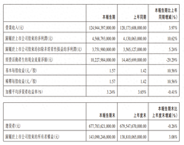 IT之家獲悉,報(bào)告期歸屬于上市公司股東的凈利潤 45.69 億元,同比增長 10.62%;歸屬于上市公司股東的扣除非經(jīng)常性損益的凈利潤 37.52 億元,同比增長 5.24%;基本每股收益 1.57 元╱股,同比增長 10.56%;研究及開發(fā)費(fèi)用 106.1 億元,同比增長 70.10%。