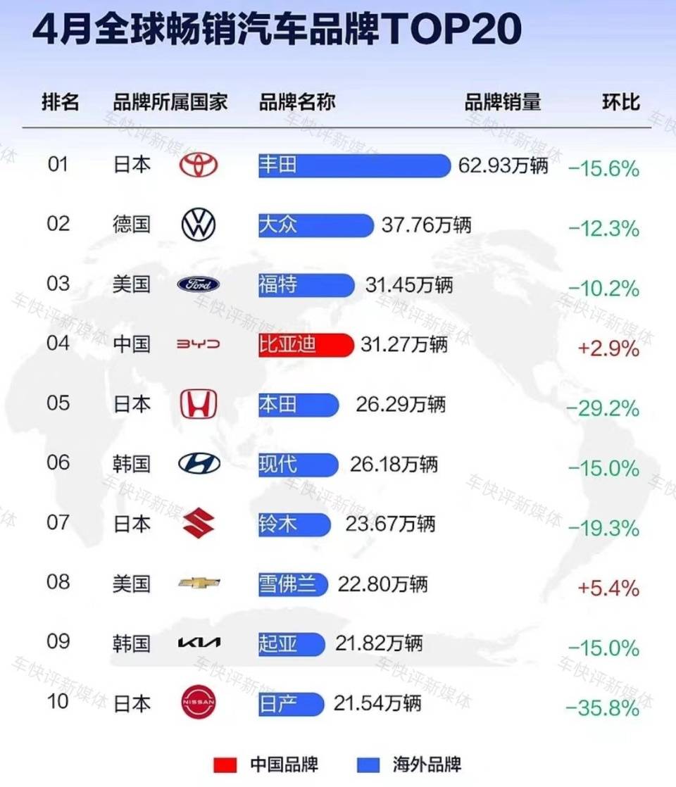 這次我們就不看國(guó)內(nèi)銷(xiāo)量數(shù)據(jù)了,直接看4月全球汽車(chē)品牌的銷(xiāo)量數(shù)據(jù)。比亞迪以31.37萬(wàn)輛的銷(xiāo)量,僅次于豐田、大眾和福特,位居銷(xiāo)量榜的第四名。