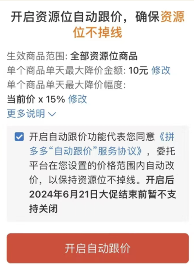 但拼多多這次的自動跟價是算法決策,本質是商家“提前同意”,算法修改價格。商家給個底價,底價之上拼多多說了算。你也可以不參加,不過資源位的流量大概率跟你無關了。