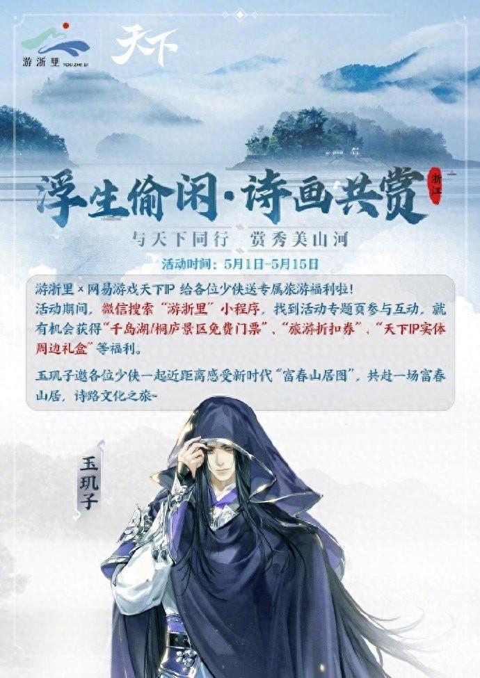 不妨跟著“游浙里” 來一場新時代的富春山居,詩路文化之旅!游浙里攜手網易游戲天下IP,邀少俠們一同走進傳世名畫,在山水秀色中品江南雅韻。即日起,在游戲內掃描“游浙里”二維碼或微信搜索“游浙里”小程序,前往活動專題頁參與互動就有機會獲得“千島湖/桐廬景區免費門票”、“旅游折扣券”、“天下IP實體周邊禮盒”等驚喜福利。