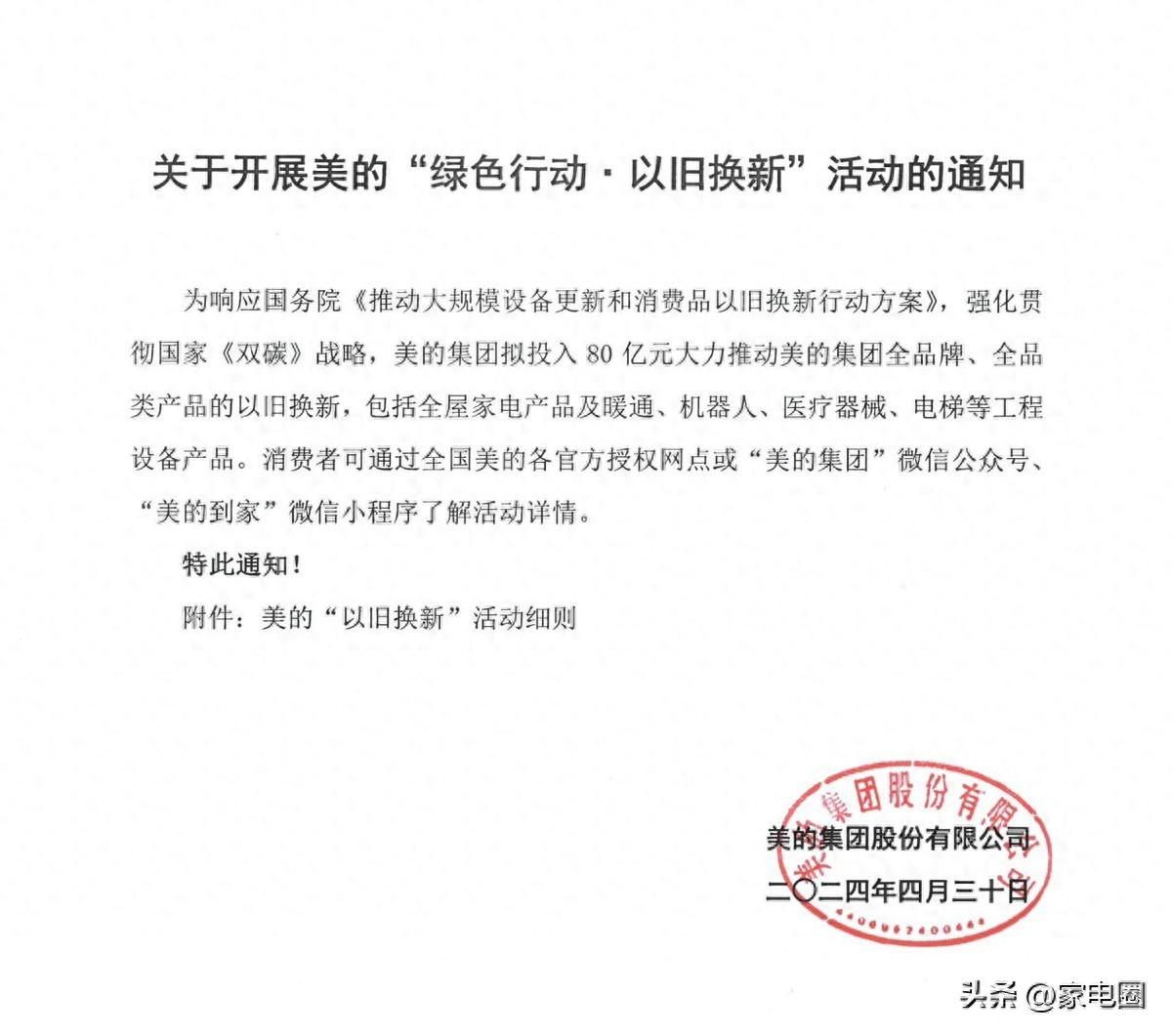 4月30日,為強化貫徹國家“雙碳”戰(zhàn)略,響應國務院《推動大規(guī)模設備更新和消費品以舊換新行動方案》,美的集團擬投入80億元大力推動全品牌、全品類產品的以舊換新和設備更新,包括全屋家電產品及暖通、電梯、機器人、醫(yī)療器械等工程設備。消費者可通過全國美的各官方授權門店或“美的集團”微信公眾號、“美的到家”微信小程序了解活動詳情。
