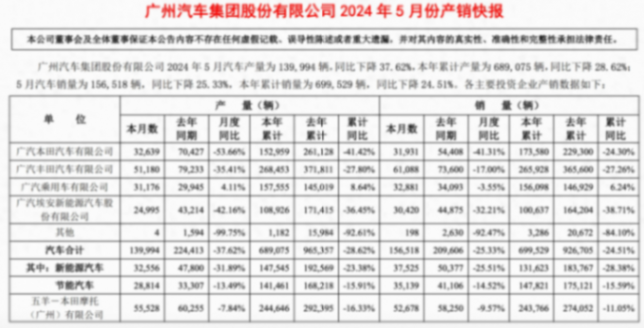 6月7日,廣汽集團發布了5月的產銷快報,快報顯示,5月廣汽集團汽車銷量為15.5萬輛,同比下滑25.33%。據分析,這已經是廣汽集團第五個月銷量同比下滑,也就是目前自2024年以來都在下滑,其中1-5月分別下滑10.18%、38.95%、22.62%、24.78%、24.51%。截止5月,廣汽集團年內累計銷量為69.95萬輛,同比下滑24.51%。