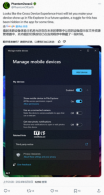 6 月 11 日消息,消息源 @PhantomOfEarth 于 6 月 9 日發布推文,表示微軟公司正在測試 Windows 11 文件管理器應用新功能 / 特性,可以查看和管理安卓手機上的文件,簡化 Windows 和安卓設備之間的文件傳輸過程。
