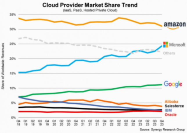 據于見專欄報道,2023年Q4云計算服務廠商市占率調查報告顯示,來自微軟的“Azure微軟云”市占率提升至24%,來自谷歌公司的“谷歌云”市占率也上升到11%。正所謂此消彼長,這兩家企業蠶食的正是原本屬于AWS的市場份額。