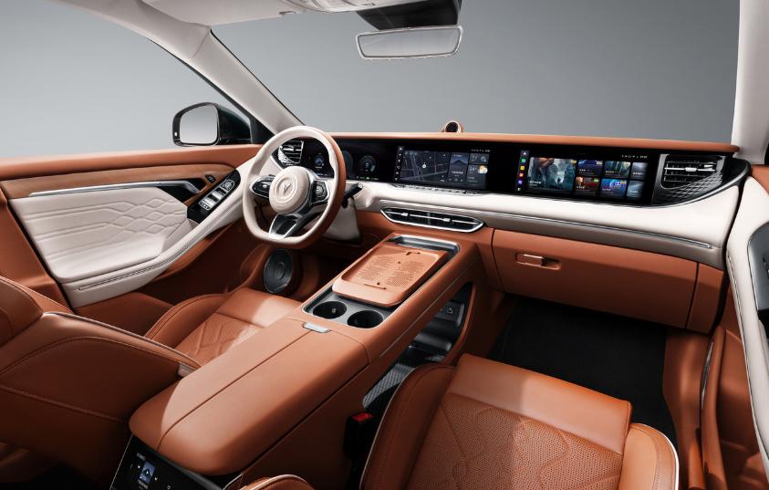 落座車內,目光所及之處皆由皮質以及軟性搪塑材質包裹,質感表現良好,這也是嵐圖品牌的一貫風格。啟動車輛后,一體式可升降三聯屏緩緩升起,三塊屏幕的尺寸均為12.3英寸,其內部搭載高通驍龍8155旗艦機芯片,屏幕UI界面設計較為簡潔,操縱過程相當順滑。此外,主副駕駛乘員可以通過三屏聯動相互推送導航、音樂等信息,如此一來,駕駛員便可更加專注于駕駛本身。