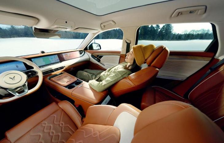 該車車內座椅由皮質+翻毛皮材質混搭包裹,前后排座椅的質感相同,表面皮質相當柔軟,內部填充物厚實,乘坐時有著明顯的陷入感。與此同時,前排用戶還能體驗到座椅電動調節,座椅加熱/通風/按摩等一系列功能。