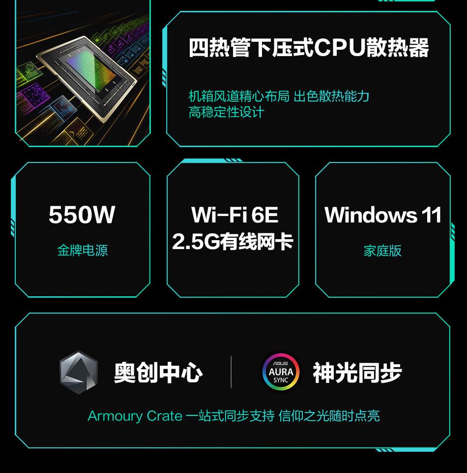 散熱方面,CPU 使用四熱管下壓式 CPU 散熱器;顯卡采用雙軸流風扇散熱、金屬背板,并原裝 550W 金牌電源。