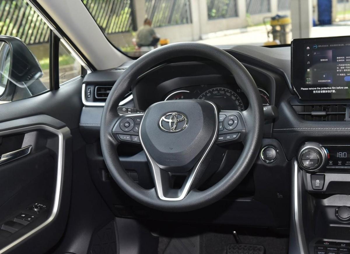 內飾部分,豐田的內飾設計上不追求未來感,但追求舒適感,很多錢用在了材料方面。車內很多地方都是皮質材料覆蓋,質感不錯,看起來很高端。科技方面,這款車也有10.25英寸中控屏,長方形設計,所以視覺沖擊力不是很強。不過,內部的功能還不錯,支持彎道減速、PCS預碰撞等功能,安全方面的表現(xiàn)還不錯。傳統(tǒng)的擋把,旋鈕控制的空調出風口,常規(guī)的三輻式結構方向盤,這是榮放最后的倔強,保留了部分機械感。