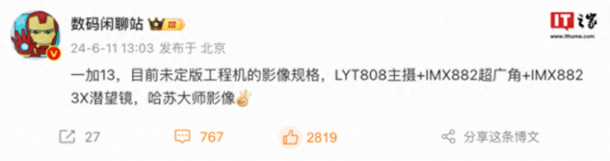 6 月 11 日消息,博主 @數(shù)碼閑聊站 今日發(fā)文爆料,一加 13 手機(jī)目前未定版工程機(jī)的影像規(guī)格為“LYT808 主攝 + IMX882 超廣角 + IMX882 3X 潛望鏡”,支持哈蘇大師影像。