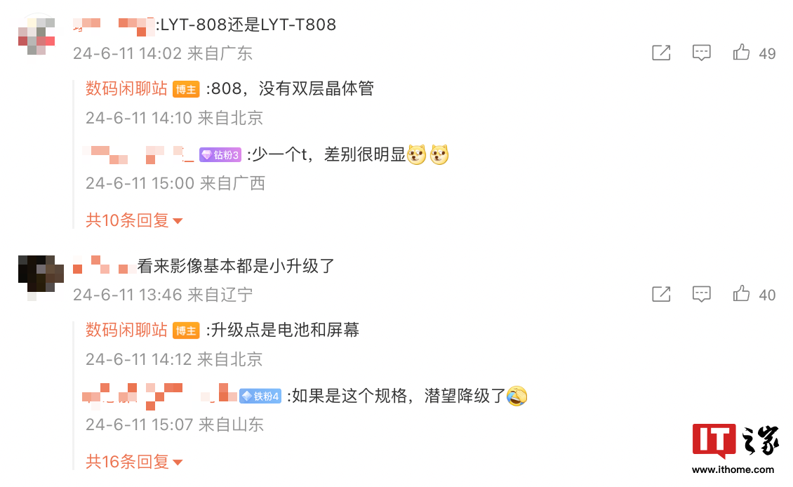 有網(wǎng)友在評(píng)論區(qū)中留言詢問主攝具體型號(hào),博主回復(fù)“808,沒有雙層晶體管”;另有網(wǎng)友評(píng)論“看來影像基本都是小升級(jí)”,博主對(duì)此表示“升級(jí)點(diǎn)是電池和屏幕”。