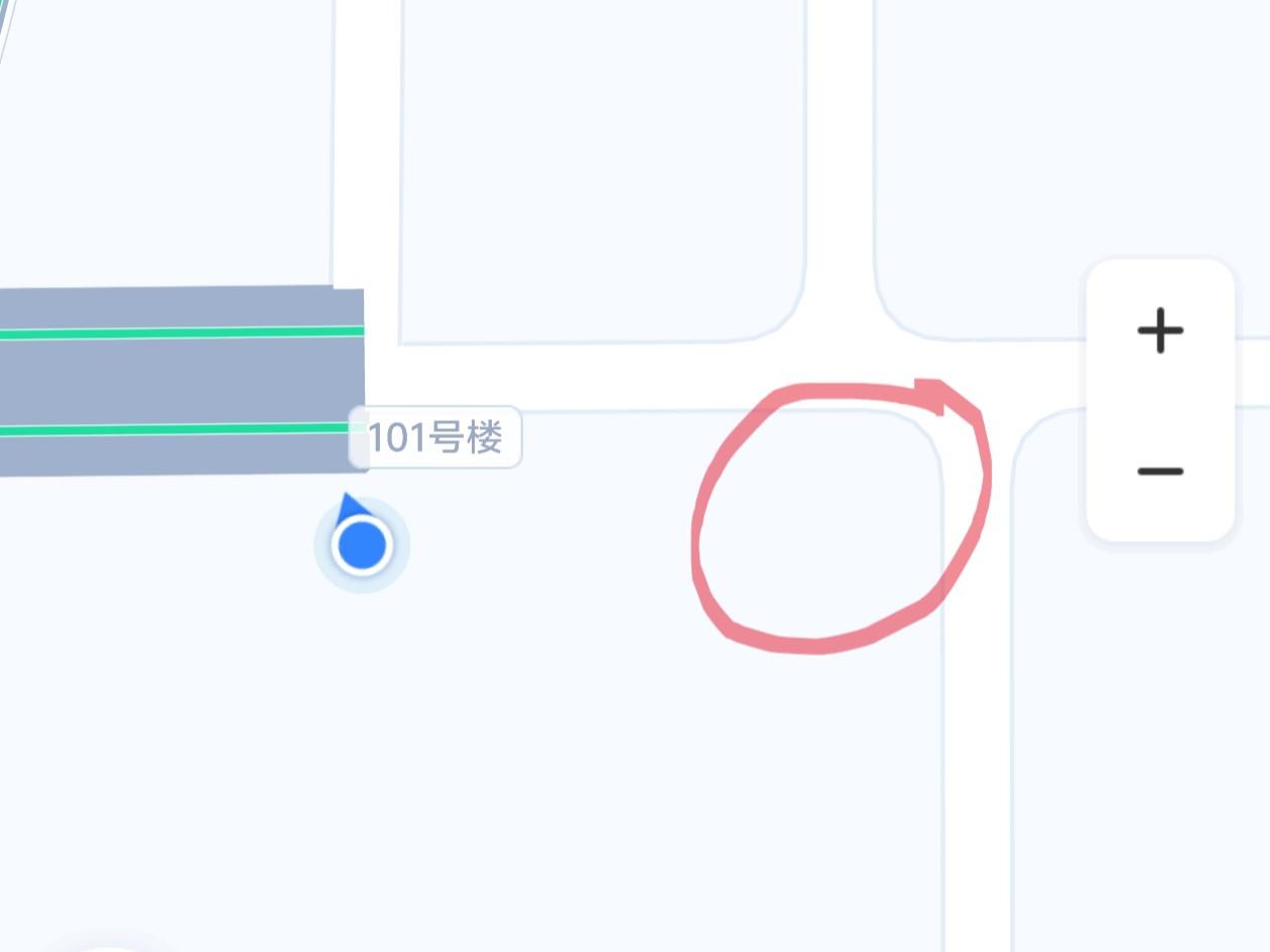 我在室內用某度導航測試了一下,可以看到我的定位是在這個叫101號樓的位置,但我實際位置是下圖中標記的,大概相差不到20米的距離吧。