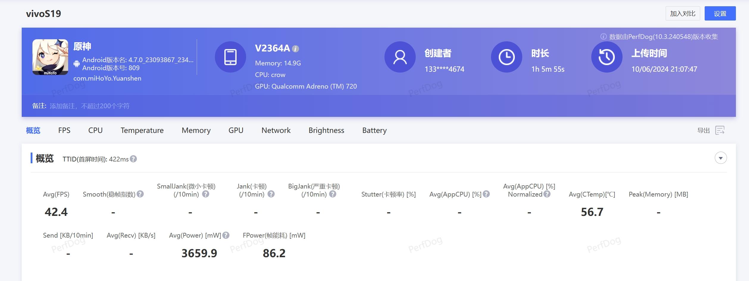 盡管是主打人像拍攝的手機,但我也不否定會沒人奔著用S19玩游戲去的。因此我也“多事”地玩了1小時05分的原神,數據通過專業評測軟件PerDog(性能狗)獲取,畫質開到上限,幀率60FPS,wifi、最高亮度、26℃空調房。