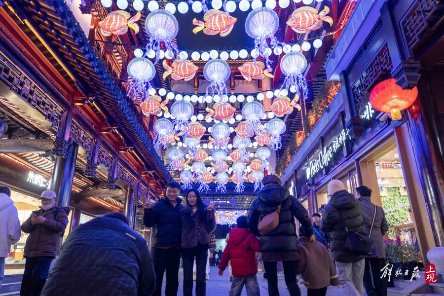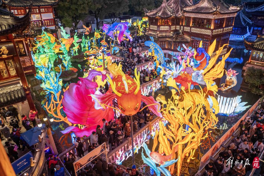 四大門頭、五大場景打造深海與河圖之象,呈現(xiàn)生肖龍與海洋動植物交織的奇境;魚群搖曳、浪卷云舒,游人徜徉亭臺樓閣間,宛若遨游在海錯翩然、星漢燦爛綺夢幻境之中……1月21日晚,2024豫園民俗藝術(shù)燈會正式亮燈。
