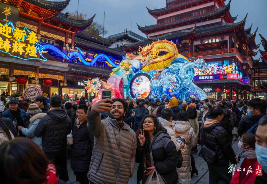 今天傍晚的豫園千燈競放、溢彩流光,從四面八方涌入的海內外游客競相在此觀燈賞景、打卡留影,一派節日歡樂氣氛。
