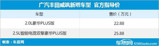 6月6日,廣汽豐田威颯新增車型正式上市。新車共推出兩個版本,分別為2.0L豪華PLUS版和2.5L智能電混雙擎豪華PLUS版,售價分別為22.88萬和25.88萬元。此外,官方還推出了6月購車權益,威颯全系車型可享2萬元回饋禮以及5000元見面禮。