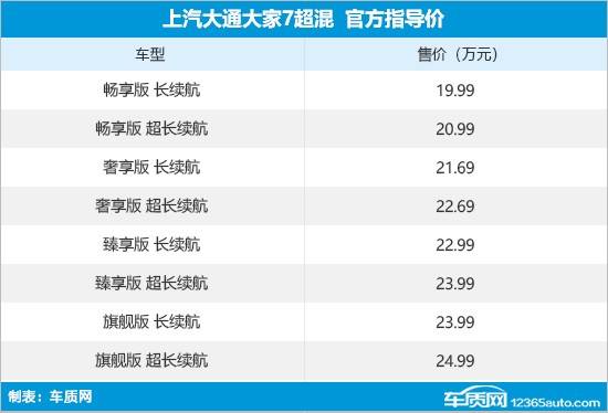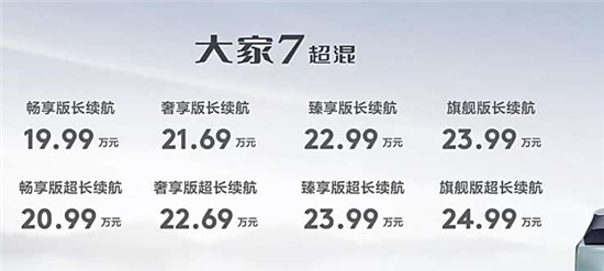 6月7日,上汽大通大家7插電混動版正式上市,新車推出8款車型,售價區間19.99-24.99萬元。新車搭載1.5T插混專用發動機,以及24.7kWh磷酸鐵鋰與39.7kWh三元鋰電池組。綜合續航超過1300公里。