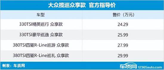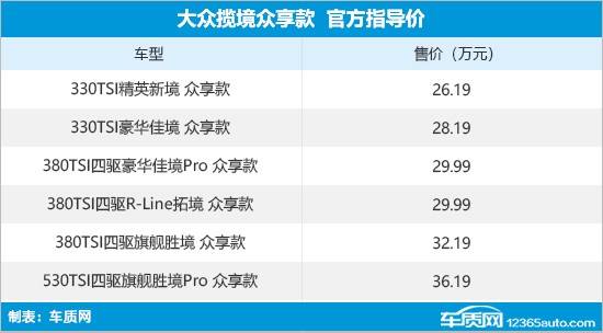6月7日,一汽-大眾攬境/攬巡眾享款車型正式上市,其中攬境售價26.19-36.19萬元;攬巡售價24.29-29.99萬元。新車的售價相比老款車型有所下調,最高降價幅度可以達到4.3萬元,除此之外還針對配置方面進行了一定的優化調整。