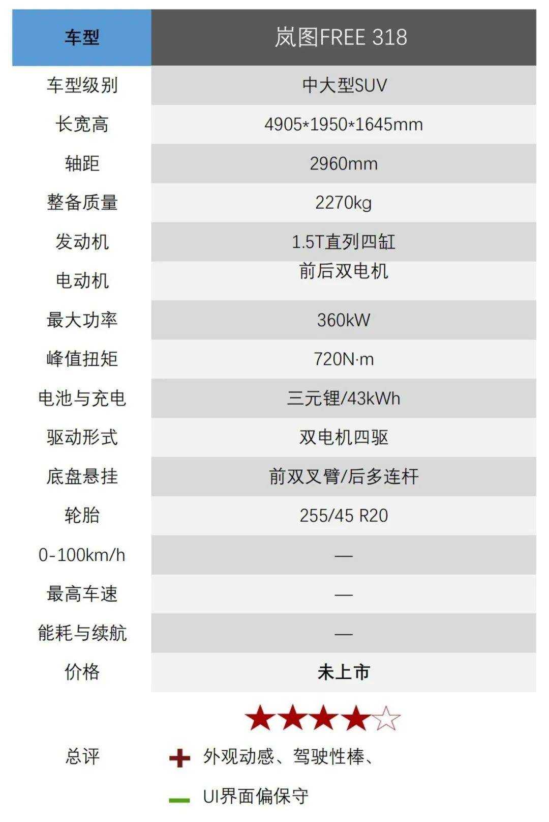不過就我們現在試駕的嵐圖FREE 318而言,整體產品力依然在線,擁有動感前衛的外型、扎實的底盤用料和調校、不露怯的智能化表現,并且匹配頗具誠意的價格。而在新款318兩驅車型將純電續航里程提升到318km后,城市通勤的經濟性和便捷性進一步提升,值得我們等待其正式發布的價格。