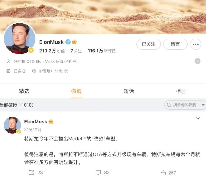 6月9日,特斯拉的首席執(zhí)行官埃隆·馬斯克在微博上發(fā)聲表示:特斯拉于今年并不會去推出 Model Y 的“改款”車款。