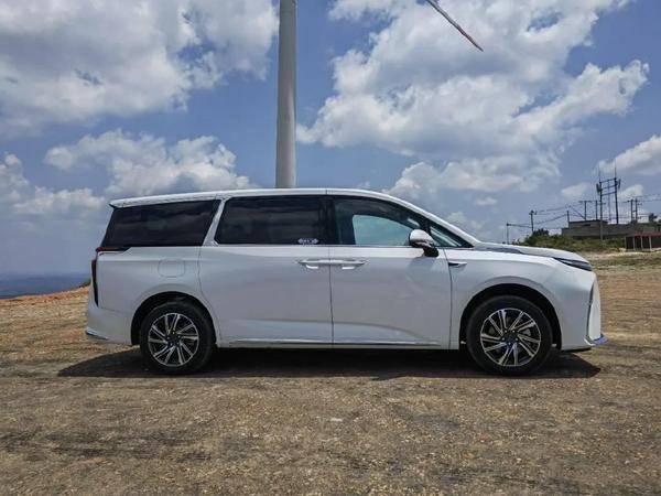 車身側(cè)面,擁有比較魁梧的身材,平直的車頂線條能夠進(jìn)一步保障車內(nèi)的乘坐空間。同時,車窗面積較大,提供良好的采光和視野。兩側(cè)后翼子板處分別設(shè)置了加油口及充電口。多處細(xì)節(jié)均采用鍍鉻飾條做點綴,進(jìn)一步提升高級感。此外,還配備了電動側(cè)滑門,方便乘客上下車。輪圈造型也比較個性,而且是低風(fēng)阻輪圈,與整車的設(shè)計風(fēng)格非常搭。