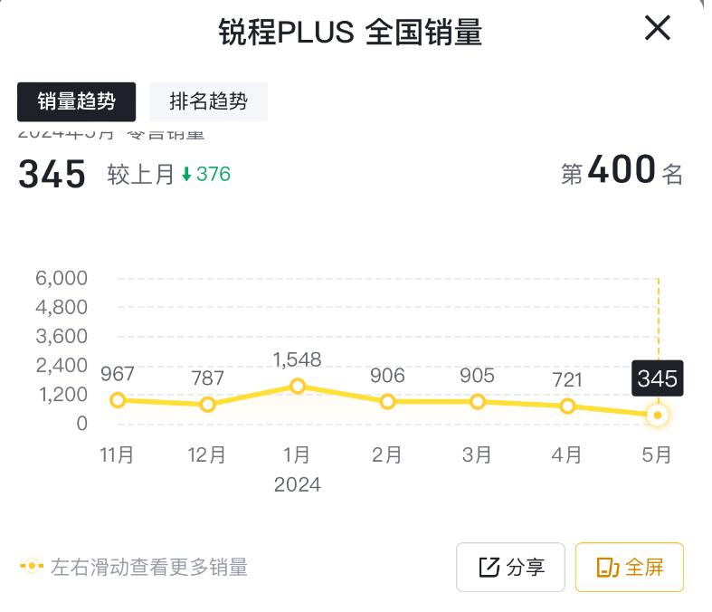 行業(yè)綜合銷量數(shù)據(jù)顯示,2024年1-5月份,銳程PLUS的單月零售銷量分別為1548臺、906臺、905臺、721臺、345臺。