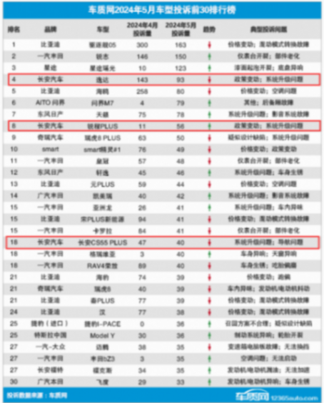 2024年5月份,長安旗下有3款車型上榜,包括長安逸達(dá)、銳程PLUS以及長安CS55 PLUS等。不過,對于第三方平臺的這些投訴,目前長安官方尚未公開回應(yīng)。