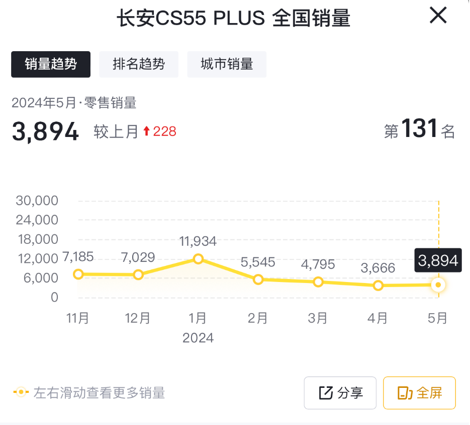 行業(yè)綜合銷量數(shù)據(jù)顯示,2024年1-5月份,長安CS55 PLUS的單月零售銷量分別為11934臺、5545臺、4795臺、3666臺、3894臺。