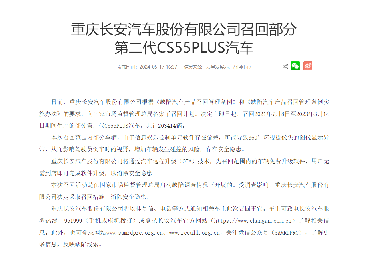 在國家市場監(jiān)督管理總局啟動缺陷調(diào)查的情況下,受到調(diào)查影響,長安決定召回部分長安CS55PLUS車型,數(shù)量達(dá)到了203414輛。