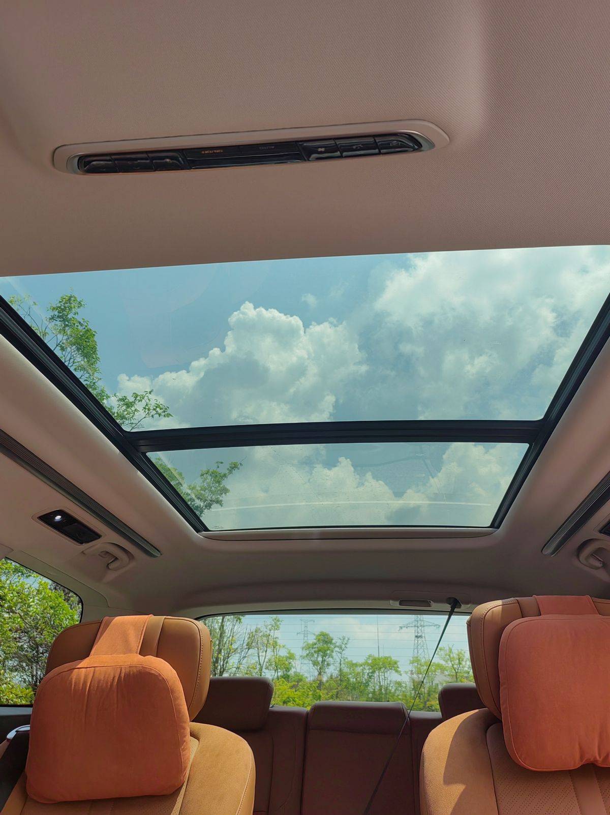 第二排還配有小桌板,可以方便的放置隨身物品以及隨時辦公,非常人性化。在前排座椅背部下方還配有腳踏,可以說對二排乘客的照顧真是無微不至。超大的天窗可以讓乘客隨時享受陽光的沐浴,令人非常愜意。