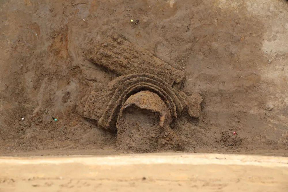 記者從鄴城考古隊獲悉,2023年度在對東魏北齊鄴城朱明門外護城河遺跡的發掘中,考古人員發現多處鎧甲、兵器等戰爭遺留,以及磚砌“金剛墻”和等距均勻分布的柱洞等遺跡,鎧甲、兵器等珍貴文物已進行整體套箱,運回實驗室進行進一步細致考古清理。
