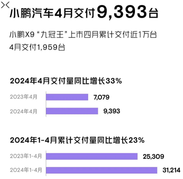 小鵬汽車4月共交付新車9393臺,同比增長33%,環(huán)比增長4%。其中,X9交付1959臺,上市四月累計交付近1萬臺。2024年1月-4月,小鵬汽車累計交付新車共31214臺,同比增長23%。