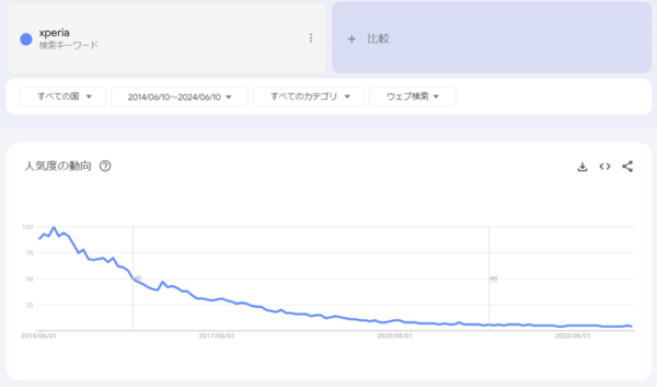 上面這張圖表顯示了過去10年中“Xperia”這個(gè)關(guān)鍵詞在Google搜索中的流行程度,最高得分為100。正如大家所看到的,當(dāng)放眼全球時(shí), “Xperia”的受歡迎程度已經(jīng)從峰值的“100”跌至“4”,約為1/25 。正如曲線所展示的那樣,2014年是索尼Xperia Z2一代的巔峰之年,在第一代Z和Z1獲得好評(píng)后,日本國(guó)內(nèi)消費(fèi)者對(duì)Xperia智能手機(jī)的關(guān)注度陡然增加。