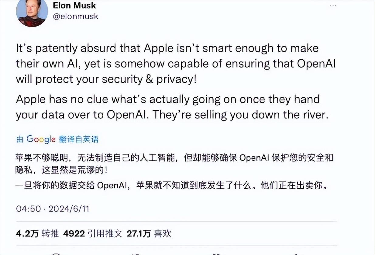 他這是一會兒嘲笑蘋果無謀、庫克少智, “ 蘋果壓根沒有自己開發 AI 的能力! ”