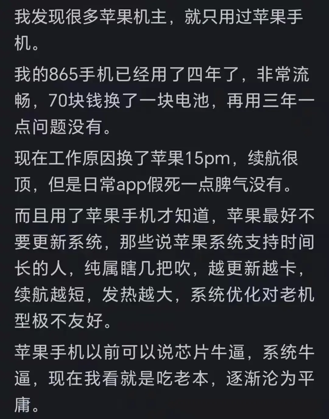 monxo的說法贏得不少認同。"用了幾年就會覺得手機卡卡的,根本沒法好好用了""iPhone續航能力實在太差,兩三年就得換電池"。更有果粉吐露無奈:"我都習慣了每兩年必換新機,蘋果說4-5年純屬忽悠。"但也有持不同觀點者認為,使用習慣和保養方式很大程度決定了使用年限。