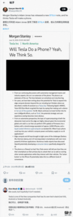特斯拉則在這條推文下方發表了自己的看法:“我們可以(造手機),但希望這不必要。特斯拉是少數幾家擁有自己的技術棧(不是 iOS、Android 或 Android 的分支)的公司之一。”